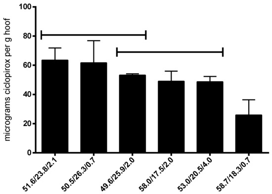 Amount of ciclopirox base found in the hoof after 11 days of the diffusion experiment. Black lines represent homogeneous groups (one-way ANOVA and Tukey test, α < 0.01).