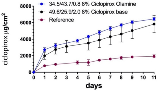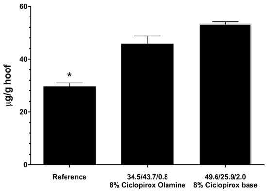 The amounts of ciclopirox and ciclopirox olamina recovered from the bovine hoof slices after the experiment were 29.7 ± 0.36, 45.8 ± 2.93, and 53.26 ± 0.89 for reference, 34/43.7/0.8 8% ciclopirox olamine, and 49.6/25.9/2.0 8% ciclopirox base, respectively. According to Hui et al. [27], the fingernail density is 1.33 g/mL. If we assume that it is similar for the bovine hoof, the drug concentrations in the slices are 39.5, 60.9, and 70.8 µg/mL, which are higher than the minimum inhibitory concentrations (MICs) of ciclopirox for Trichophyton rubrum DSM 4167 (15.6 µg/mL) [28] or seven T. rubrum strains (24.13 µg/mL) [29].