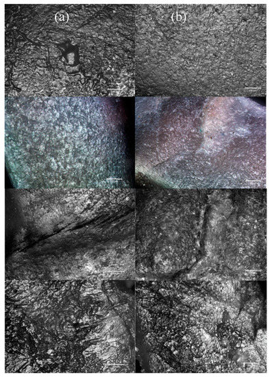 Confocal optical microscopy micrographs of the nail surfaces of some volunteers. (a) Treated nails, (b) untreated nails.