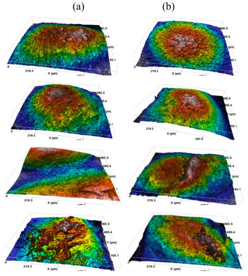 Images of the models of the dorsal surface of the nails of several volunteers obtained by non-contact 3D surface profilometry. (a) Treated nails, (b) untreated nails.