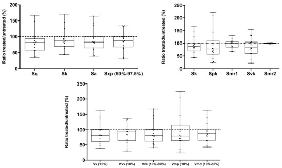 Box-and-whisker charts showing the relationship between the values of 3D parameters (S-parameters) and functional (volume) parameters of treated and untreated nails.