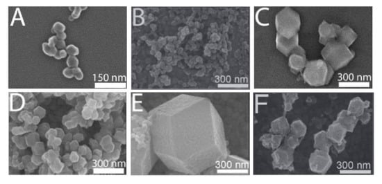 ZIF-90 nanoparticles (NPs) synthesized in trioctylamine at (A) 0 °C, (C) 100 °C, and (E) 150 °C and particles synthesized at room temperature using (B) trioctylamine, (D) tributylamine, (F) trimethylamine []. Reprinted (adapted) with permission from (Versatile Synthesis and Fluorescent Labeling of ZIF-90 Nanoparticles for Biomedical Applications). Copyright (2016) American Chemical Society.