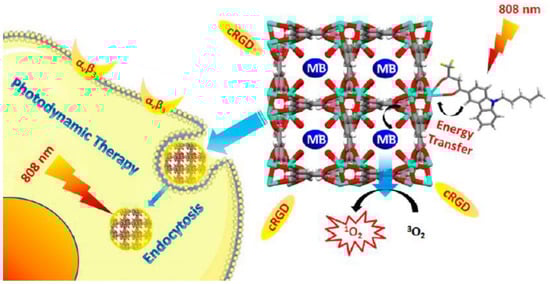 Here, we first introduce several commonly used drugs and materials for photoresponsive therapy. As a kind of chromophores, porphyrin absorbs visible light, producing a singlet excited state that decays to the first triplet excited state []. This last state transfers its energy to molecular oxygen (3O2) in the medium, generating singlet excited oxygen (1O2), which is responsible for the death of cancer cells. Upconversion nanoparticles (UCNPs) are a class of materials that satisfy the anti-Stokes law of illumination. In other words, the materials can be pleased to be emit high-energy light by low-energy light, such as infrared light to excite visible light. They can be used for biomonitoring, medical treatment, CT and MRI. Currently, researchers in cancer treatment have a tendency to link this material with other carrier materials to meet high-efficiency diagnosis and treatment. This review will introduce UCNPs in combination with MOFs for targeting cancer in Section 3.4 more elaborate.