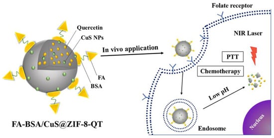 Schematic illustration of the combinational therapy platform based on folic acid (FA)−bovine serum albumin (BSA)-modified ZIF-8 (FA−BSA/CuS@ZIF-8-QT) []. Reprinted (adapted) with permission from (CuS@MOF-Based Well-Designed Quercetin Delivery System for Chemo–Photothermal Therapy). Copyright (2018) American Chemical Society.