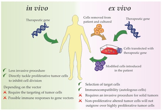 The mounting knowledge on the characteristics of tumor cells and surrounding TME have sparked the use of gene therapy to tackle cancer molecular mechanisms. Gene therapy consists of the introduction of exogenous nucleic acids, such as genes, gene segments, oligonucleotides, miRNAs or siRNAs into cells envisaging a target gene edition, expression modulation of a target gene, mRNA or synthesis of an exogenous protein [,,,,,,,,,,,]. Gene transfer into tumor cells has been demonstrated via administration of therapeutic nucleic acids (TNAs) ex vivo and/or in vivo (Figure 1) []. In the ex vivo approach, patient-derived tumor cells are collected, propagated usually as 2D monolayers, manipulated genetically and then introduced back into the host []. In the in vivo approach, TNAs may be introduced in loco into the tumor cells, systemically via intravenous administration, or in a pre-systemic manner through oral, ocular, transdermal or nasal delivery routes, depending of the specific localization of tumors and disease progression [,,]. In the case of systemic and pre-systemic deliveries, the administration of naked TNAs is hindered by biological barriers, nuclease susceptibility, phagocyte uptake, renal clearance and/or immune response stimulation []. Hence, the use of stable carriers/vectors that protect the nucleic acid cargo from circulatory nucleases, avoid the immune system, and ensure the efficient targeting of the therapeutic vector into the tumor cells, without dissipation in the body through lymphatic and blood systems and avoiding non-target cells is required []. Despite the apparent limitations of the in vivo approach, it is less invasive and more suitable for cancer treatment than ex vivo approaches, since the latter require a proliferative advantage of transfected cells, which is antagonist to the major objectives of cancer gene therapeutics that mainly aims to inhibit the tumor progression by tackling the tumor cell division ability [,,,]. Nevertheless, it is important to highlight the relevance of ex vivo therapy in indirect immune gene-based therapies (detailed in Section 2.7). In these ex-vivo approaches, immune cells are collected from the patient’s blood and genetically engineered to tackle the tumor cells (reviewed in [,]).