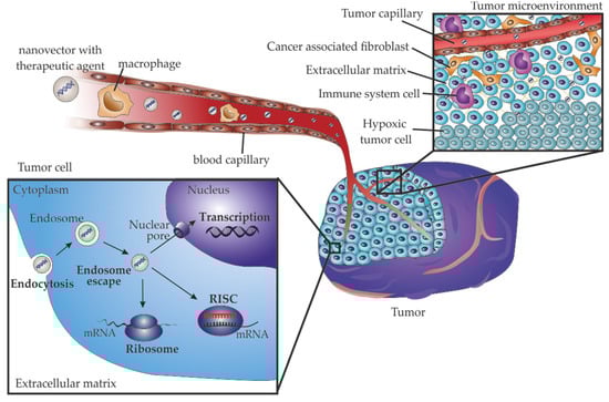Barriers that nanoparticles must overcome for effective cancer gene delivery. In a systemic administration, nanoparticles should travel through the blood circulatory system, avoiding the immune system. The accumulation at the tumor occurs through passive targeting by the enhanced permeability and retention effect. Nanoparticles also have to penetrate into the most inaccessible areas of the tumor to reach the hypoxic tumor region with low oxygenation and dense extracellular matrix. After reaching tumor cells, nanoparticles should be internalized, which is mainly accomplished via endocytosis, and then escape from the endosome to efficiently deliver the cargo into the cytoplasm, when targeting RNA, or travel to the nucleus, when targeting DNA.