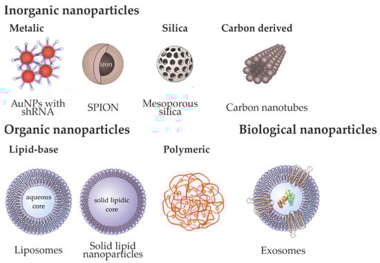Nanoparticles used for gene delivery. Examples of metallic nanoparticles are gold nanoparticles (AuNPs) that can be functionalized with several molecules, e.g., short hairpin RNA (shRNA) for gene silencing. Other examples of inorganic nanoparticles are superparamagnetic iron oxide nanoparticles (SPION) containing an iron core coated with biocompatible polymers, mesoporous silica nanoparticles or carbon nanotubes. Examples of organic nanoparticles are polymeric nanoparticles, and liposomes and solid lipid nanoparticles (SLNs), which are lipid-base nanoparticles that differ mainly in the aqueous and lipidic core and the number of lipid layers. Exosomes are nanovesicles secreted by eukaryotic cells composed by a bi-lipidic membrane containing membrane proteins, that surround an aqueous lumen containing proteins and nucleic acids.