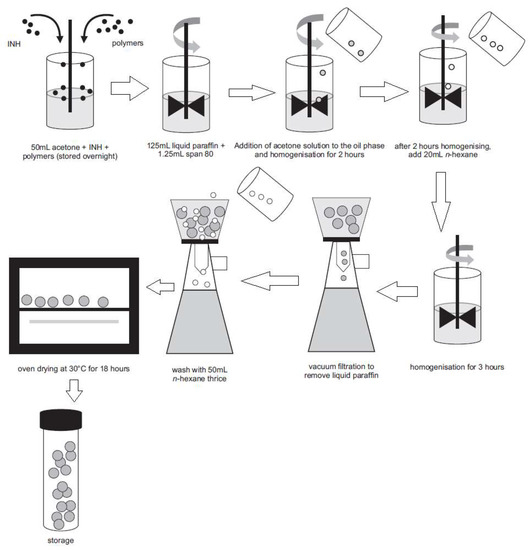 In this study, non-aqueous emulsions of acetone (dispersed phase) and liquid paraffin (continuous phase or dispersion medium) were used as these solvents reduce partitioning of the highly water-soluble INH from the microspheres that are formed [21,22,23]. Acetone was selected as the dispersed phase as it is immiscible with liquid paraffin [21,24]. Hydroxypropylmethylcellulose acetate succinate (HPMC-AS) (Shin-Etsu Chemicals Co., Ltd., Tokyo, Japan) was dispersed in 50 mL acetone (Associated Chemical Enterprises, Southdale, South Africa) in a 400 mL beaker and the mixture left to stand overnight to ensure the polymer was completely dissolved, after which Eudragit® L100 (Rohm Pharma, GmbH, Darmstadt, Germany), microcrystalline cellulose (MCC) Avicel® PH101 (FMC, Philadelphia, PA, USA) and an accurately weighed quantity (0.75 g) of INH (China Skyrun Industrial, Tsim Sha Tsui, Hongkong, China) were dispersed in the acetone solution. Light liquid paraffin (ADC Laboratories, Durban, South Africa) (125 mL) containing 1% v/v Span 80 (Sigma Aldrich, South Africa) was placed in a 250 mL beaker and agitated with a homogenizer (Virtis Company, New York, NY, USA) fitted with a four-blade ‘‘butterfly’’ propeller of 50 mm diameter to produce an homogeneous oily phase. The entire volume of the previously prepared acetone solution was poured into the oily phase and dispersed. The system was maintained at 22 °C to allow the acetone to evaporate. The amount of liquid paraffin, volume of the acetone solution used, MCC Avicel® PH101 and INH content were kept constant for all batches manufactured. After 2 h of homogenization, 20 mL n-hexane (VWR Chemicals, Fontenay-sous-Bois, France) was added as the non-solvent to harden the microspheres and stirring continued for a further 3 h. The hardened microcapsules were collected using a Buchner funnel and washed 4 times with n-hexane (50 mL) to remove any residual liquid paraffin. The microspheres were dried in an oven maintained at 30 °C for 18 h and then screened to remove any residual powder prior to storage in well-sealed amber bottles (50 mL). The yield of microspheres was calculated using Equation (1).