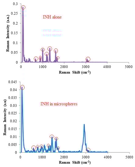 The thermograms of mixtures of INH and polymers (see Supplementary Materials Data) revealed a minimal decrease in the melting point for INH with associated broadening of the base of peaks, indicating a slight reduction in the crystallinity of INH when in mixtures. The FT Raman frequencies of vibration for the different functional groups for INH powder and microspheres, in relation to what has been reported in literature [37] revealed no significant shifts in frequency for the key functional groups of INH following manufacture as shown in Figure 3, suggesting that significant and/or detrimental interactions between INH and excipients was unlikely.
