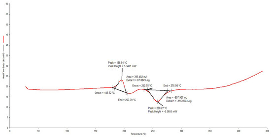 The DSC thermogram for RIF depicted in Figure 4 reveals a melting endotherm between 183.32–203.39 °C, immediately followed by an exothermic recrystallization event, which is characteristic of a solid–liquid–solid transition and finally a decomposition event at 240.78–275.58 °C. These results are similar to previously reported data [38].