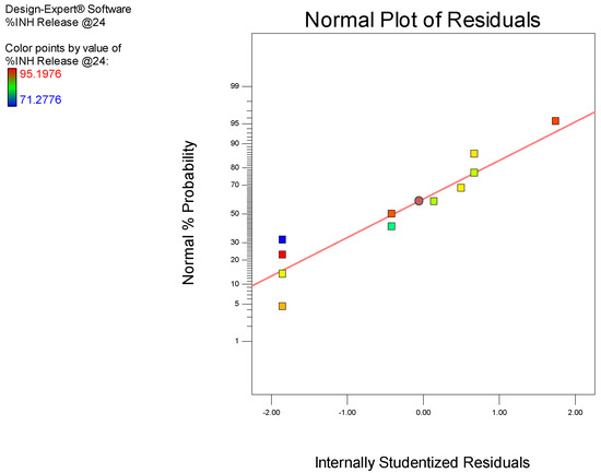 Normal plot of residuals for % INH released in pH 6.8 0.1 M phosphate buffer at 24 h.