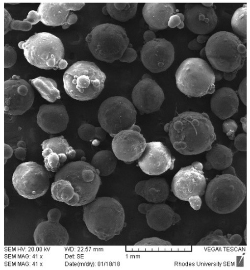 The use of a single phase of acetone resulted in the production of non-spherical microparticles with a poor yield that was attributed to the failure to form stable emulsion droplets of the polymer solution in liquid paraffin [50,51]. DCM is nonpolar, is miscible in oil, and was included to decrease the polarity of acetone to enhance the formation of a stable emulsion [50,52]. The use of DCM alone resulted in the formation of large droplets that aggregated and the use of a solvent mixture of DCM and acetone was considered suitable for this process. Acetone and DCM are miscible [53], and the use of DCM and acetone in a 3:2 ratio produced smooth spherical particles (Figure 8) that did not adhere to other particles and the walls of the beaker, and this ratio was selected for the manufacture of floating RIF particles. Following the addition of the RIF solution to liquid paraffin, small discrete oil droplets stabilized with Span® 80 were formed.