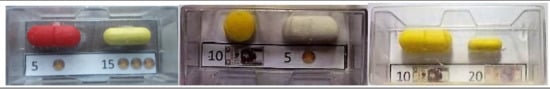 - Overgaard, A.B.A.; Møller-Sonnergaard, J.; Christrup, L.L.; Højsted, J.; Hansen, R. Patient’s evaluation of shape, size and color of solid dosage forms. Pharm. World Sci. 2001, 23, 185–188. [Google Scholar] [CrossRef]