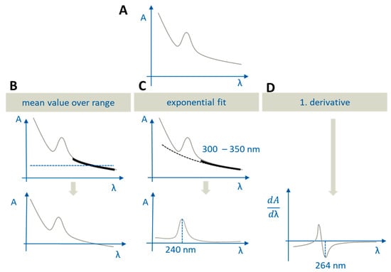 Different options to correct scattering in UV-Vis spectra: (A) Uncorrected spectrum; (B) mean value over range, black bold range: Mean value calculation (at the top) and the corrected spectrum (at the bottom); (C) exponential fit, black bold range 300–350 nm: Fitting function range (at the top). Ritonavir is quantified at 240 nm using the corrected spectrum (at the bottom); (D) first derivative and the inflection point at 264 nm, where ritonavir is quantified (at the bottom).