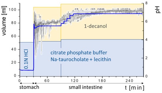 Dissolution procedure: (stomach) Formulation disperses for 30 min in 0.1 M hydrochloric acid; (early small intestine) addition of surfactant concentrate after 30 min, buffer concentrate to reach pH 5.5, and overlaying of the aqueous phase with 50 mL of 1-decanol; (late small intestine) stepwise pH-adjustment at 90 min to reach pH 6.8. The grey line in the background represented measured human gastrointestinal pH-profile [22].