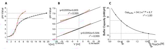 (A) pH Profile of 50 mL 0.1 N HCl by adding potassium-citrate and tri-potassium-phosphate; red line represents different buffer capacities, and black line represents similar buffer capacities between pH 5.5–6.8. Buffer capacities are similar if the slope of the titration curves at pH = 5.5 and 6.8 are similar, which is the case for the black-colored curve; (B) titration profile of adjusted buffer at 5.5 and 6.8 to determine the buffer capacity at these levels. The adjusted buffers were titrated by using either 0.1 M NaOH or HCl. The slopes represent the buffer capacity at pH = 5.5 and pH = 6.8 (black line); (C) optimization of buffer capacity by adding sodium hydroxide to the concentrate to reach fasted and fed conditions at pH = 6.8.
