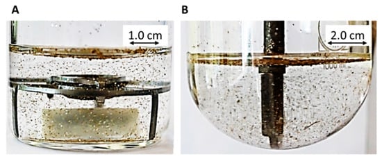 Hydrodynamic influences drug dissolution and precipitation as well as partitioning in the organic layer [12,17,19]. Therefore, sufficient mixing is of vital importance to avoid an unstirred water layer. Both described biphasic dissolution setups were assessed regarding their hydrodynamic [19]. The volumes of the aqueous phase and the mixing speed were set to 160 rpm for our method, while Xu et al. used 60 rpm for an USP II/USP IV combination [33]. To visualize the velocity of the water, glitter powder (density 1.33 g/cm [38] was used. Due to the high density of the glitter particles, they were assumed as worst-case precipitated particles. Photographic images were taken to illustrate the hydrodynamic in the dissolution vessel (Canon EOS 700D SLR, Tokyo, Japan at 1/320 s exposure time).