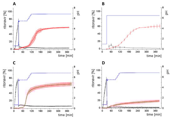 Biphasic dissolution experiments in (A) Bi-FaSSIF-V2 medium (BiPHa+), (B) Model of Xu et al. [33], (C) Bi-FaSSIF-V1 medium (BiPHa+), (D) Buffer without surfactant (BiPHa+); API concentration in the 1-decanol layer (red line, mean value and standard deviation); dissolved ritonavir in the aqueous medium (black line, mean value and standard deviation); pH values (blue line). All experiments were done in triplicate (n = 3).