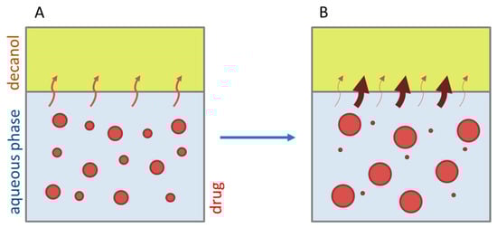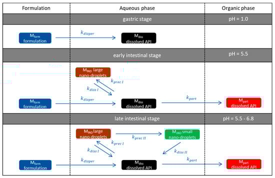- Early intestinal stage—After covering the aqueous layer with 1-decanol and changing the pH from 1.0 to 5.5, a 2-compartment model for the simulated early intestine was applied (Figure 7). Liquid–liquid phase separation (LLPS) occurs from the solution, when crystallization is slow [41] and the amorphous solubility of the API is exceeded leading to the formation of nanosized API-rich nano-droplets [33,45].In the present kinetic model, the formation of the nano-droplets refers to the generation of the large nano-droplets as shown in Figure 8 and Figure 7. The ritonavir-rich nano-droplets provide a reservoir replenishing dissolved ritonavir that irreversibly partitioned into the organic layer [33,43,46,47].