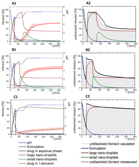 Model fit of four or five compartments compared to the experimental data (A1–C1) and mass balance of undissolved ritonavir portions (A2–C2). (A1) in Bi-FaSSIF-V2 including small nano-droplets (green line), (B1) in Bi-FaSSIF-V1 including small nano-droplets (green line), (C1) in surfactant-free buffer medium without a nano-droplet transformation. (A2) in Bi-FaSSIF-V2 including small nano-droplets (green line), (B2) Bi-FaSSIF-V1 including small nano-droplets (green line), (C2) in surfactant-free buffer medium without a nano-droplet transformation.