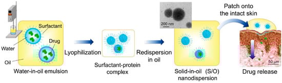 Considering the lipophobicity of the stratum corneum, we developed an oil-based nanocarrier system referred to as a S/O nanodispersion. S/O nanodispersions are oil-based nano-sized dispersions of an antigen formed by coating antigen molecules with hydrophobic surfactant molecules. The antigen–surfactant complex is derived from a water-in-oil (W/O) emulsion by lyophilization to remove the water and organic solvent followed by dispersion in an oil vehicle (Figure 2) [60]. Compared with a W/O emulsion, S/O nanodispersions exhibit higher antigen-encapsulation efficiency up to 99.5% and better stability of more than 6 months [60,61]. Owing to the hydrophobic surfactant and the oil vehicle, S/O nanodispersions can overcome the barrier of the stratum corneum to deliver antigens into the skin. The main mechanism by which S/O nanodispersions permeate the skin was elucidated by observations using confocal microscopy combined with computational dynamics simulations. Firstly, the oil vehicle acts on the stratum corneum and increases the diffusivity of the antigen in the stratum corneum and/or the partition coefficient between the stratum corneum and the vehicle [62]. Then, the surfactants dissociate after the S/O nanodispersion contacts the lipid membrane in the stratum corneum, releasing the antigen from the hydrophobic surfactant such that only the hydrophilic antigens permeate into the epidermis and dermis [62,63,64,65]. The major pathway for the antigen to pass through the stratum corneum layer observed was the intercellular route [30].