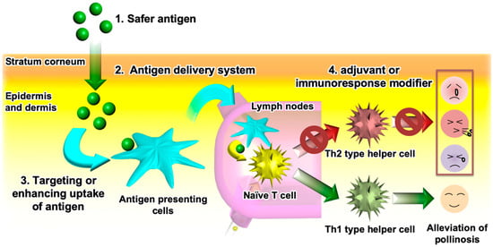 Novel TCIT methods for JCP must meet the following requirements (Figure 3): (1) use of a safe antigen to avoid cross-linking allergen-specific IgE antibodies; (2) use of an antigen delivery system which helps the antigen permeate the skin; (3) targeting of APCs or enhancing antigen uptake by APCs to improve the vaccine potency and, thus, shorten the therapeutic period; and (4) addition of an adjuvant or an immunoresponse modifier that activates Th1 immunity to suppress Th2 immunity. Novel antigens that avoid the risk of side effects from PE allergen were discussed in Section 2. Previous studies have proved that S/O nanodispersions of these antigens could break through the physical barrier of the stratum corneum to efficiently deliver them into the skin. Therefore, the use of a S/O nanodispersion to carry a safe antigen satisfies the first and second requirements in Figure 3.