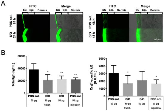 Figure 4. (A) Histological analysis of pig skin sections after application of an epitope peptide mixture in PBS solution (PBS sol.) or solid-in-oil nanodispersion (S/O) at 24 and 48 h (SC: stratum corneum; Epi.: epidermis). (B) Serum total IgE and Cry j 1-specific IgE antibody levels after immunotherapy using T cell epitope peptides in pollinosis-model mice. Reproduced from [30] with permission from Elsevier, 2017.