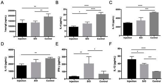Figure 5. Serum antibody and Th1/Th2 cytokine levels in pollinosis-model mice receiving treatment via TCIT and SCIT. Levels of (A) total IgE, (B) IL-4, (C) IL-10, (D) IL-13, (E) IFN-γ, and (F) IL-12 as measured by ELISA. Reproduced from [35], which is licensed under a Creative Commons Attribution-(CC BY 4.0) International License.