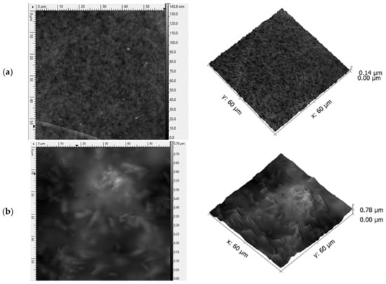 The ODF formed by casting onto a glass support plate, which had a smooth and shiny lower surface while the upper surface was rougher. Differences in the structure of both surfaces were demonstrated using AFM (Figure 3) and digital (Figure 4) microscopes. It is visible that in the presence of LO particles, the bottom surface of the film was not ideally smooth, however the roughness was very small—up to 1.4 µm. With a uniform distribution of LO, the upper surface was also relatively smooth: A maximum roughness of 5 µm was determined. Preliminary findings (studies performed with three probants) showed that the feeling of roughness in the case of the incorporation of micronized particles (even up to 40% LO) was low and should ensure an adequate acceptance of application by patients.
