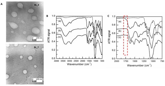 Results of TEM analyses (Figure 1A, BL_4 and BL_7 NPs) showed spherical NPs with smooth surface, where BL_4 visual inspection showed less compact nanostructures. TEM micrographs were elaborated by Jmicrovision v 1.27 and mean size of 520.73 ± 99.59 nm and 199.22 ± 44.94 were recorded for BL_4 and BL_7, respectively. Therefore, consistent diameters were obtained by both DLS and TEM characterization.