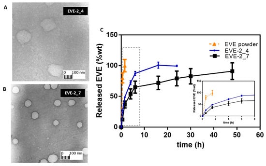 EVE ethanolic solution (0.2 and 0.5 mg/mL) was added to CS aqueous solution (5% v/v); two different CS:drug weight ratio were tested, namely 5:1 and 2:1 w/w.