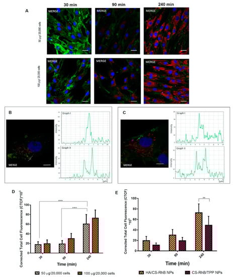 hMSCs were seeded on bottom glass slides (20,000 cells/well) and cultured in DMEM added with FBS and antibiotics (at 37 °C with 5% CO2) till reaching 60–70% of cell confluence. Then, cells were treated with 500 μL of placebo Rhodamine (RhB)-conjugated HA/CS (HA/CS–RhB) NPs suspension, prepared as described in Section 2.9.2, at different concentrations (50 µg and 100 µg/20,000 cells). RhB-conjugated CS (CS-RhB/TPP) NPs (see Section 2.9.3) were used as control whereas untreated cells were used as negative control.