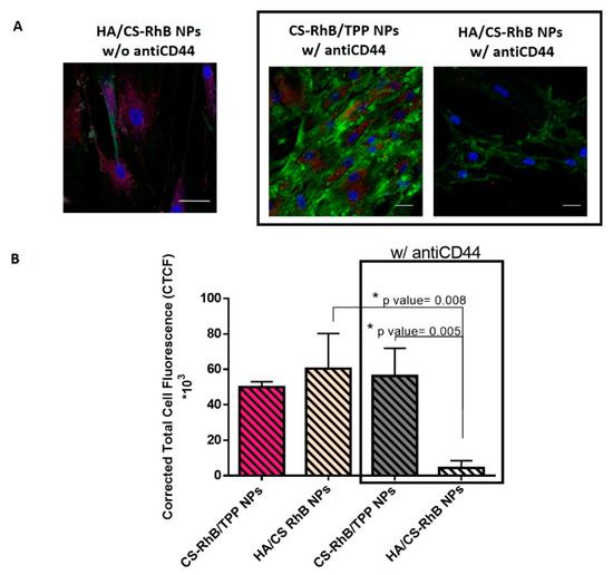 A competitive binding experiment was performed on the hMSCs. Briefly, hMSCs were pre-treated with 1.5 µg/mL of mouse anti-CD44 glycoprotein primary antibody solution for 30 min at 4 °C and then cells were incubated at 37 °C, 5% CO2 [45]. After 24h, the cells were treated with HA/CS-RhB NPs and CS-RhB/TPP NPs (50 µg/20,000 cells) for 240 min at 37 °C following double washing with sterile PBS, fixation with 4% w/v paraformaldehyde aqueous solution and 10 min incubation.