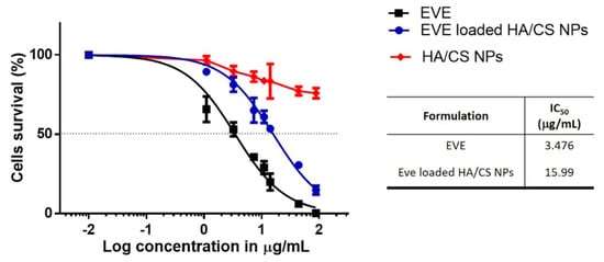 Cytotoxicity results obtained by incubating hMSCs with EVE loaded HA/CS NPs, HA/CS NPs and free EVE. The graph shows the cell viability curves for the experimental conditions fitted with a sigmoidal dose-response curve. The resulting IC50 values are shown in the table. Results were expressed as mean ± SD.