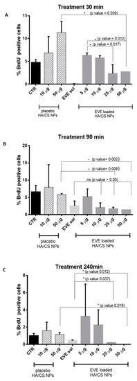 Effect on cell proliferation of placebo HA/CS NPs (10 and 50 µg/20,000 cells), EVE solution (EVE sol, 2.2 μg/20,000 cells) and EVE loaded HA/CS NPs after 30 min (A), 90 min (B) and 240 min (C) of treatment.