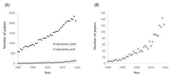 Number of papers published from the years 1980 to 2000. The numbers were obtained from a Pubmed search using keywords of liposomes (Liposomes_total) or liposomes and oral (Liposomes_oral). (A) represents both results, ‘Liposome_total’ and ‘Liposomes_oral’, for comparison. (B) represents ‘Liposomes_oral’ only to show the increasing trend.