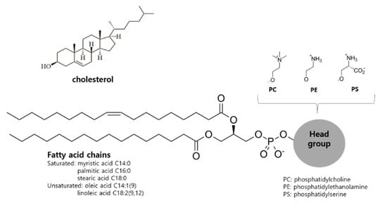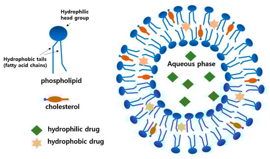 Liposomal membranes are analogous to the cell membranes composed of phospholipids bilayers. Phospholipids can spontaneously form vesicles upon hydration with aqueous media due to the amphiphilic molecular structure possessing a hydrophilic phosphatidyl head group and hydrophobic fatty acid tails, as shown in Figure 2. Cholesterol (CH) can also be easily incorporated into the liposomal membrane in the same manner as the plasma membrane and stabilize the membrane modulating drug release, as presented in Figure 3 [6]. As shown in the structure, hydrophilic drugs can be encapsulated into the inner aqueous phase, while hydrophobic drugs reside in the lipid tail domain of the bilayer. Similarly to biomembranes, liposomal membranes are fluidic; hence, the encapsulated drugs can be released by or leaked out of the liposomes. The release rate has been known to be dependent on the composition of liposomal membranes, such as the presence of CH and the type of fatty acid acyl chains of the phospholipids [11].