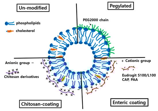 As shown in Figure 5, surface modification with polyethylene glycol 2000 or coated with acid-resistant polymers and mucoadhesive chitosan derivatives was applied to protect liposomes from the harsh environment of GI tract [49]. Through enteric coating, more liposomes would survive in the GI tract and hence, prolonged release could be achieved from the small intestine up to the large intestine. In the studies listed in Table 1, enteric coating was accomplished through a charge interaction between positively charged liposomes and negatively charged coating agents such as Eudragit S100 and L100. Enteric coating effect was prominent, showing 3.1- and 5.1-fold increases of BA for docetaxel and sorafenib, respectively, as shown in Table 1 [19,30,63]. In contrast, coating with CAP increased the BA of halofantrine only by 1.4-fold [63]. The difference were the result of the additional components of liposomes, such as bile salt and TPGS, as is the cases for docetaxel and sorafenib. Pegylated liposomes were also tried for daidzein [43]. Pegylated liposomes showed sustained release of daidzein in pH 1.2 and pH 6.9, suggesting prolonged stability in the GI tract. Pegylated liposomes might not be taken up in their intact form by epithelial cells due to steric hinderance by hydrophilic polyethylene glycol chains. Hence, it may be the enhanced stability of the pegylated liposomes in the GI tract that contributes to the improved BA.
