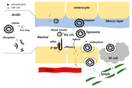 In general, conventional liposomes or other nanoparticles have been believed not to cross the mucosal barrier in the GI tract because of their relatively large size. Therefore, it has been suggested that drug is released to be absorbed, or transformed into mixed micelles in the GI tract before being transported to the epithelial cells for absorption, as depicted in Figure 6 [64]. However, M cell-mediated uptake has been also suggested for macromolecular drugs such as insulin, and hence, has drawn attention for the absorption route for liposomes and other nanoparticles [65]. Nevertheless, the absorption of intact liposomes has not been regarded as a significant route because M cells represents only 1% of the total epithelial cell population [66]. There have been various attempts to increase the permeability of the free form of drugs released from liposomes or the encapsulated form in intact liposomes, as described below.