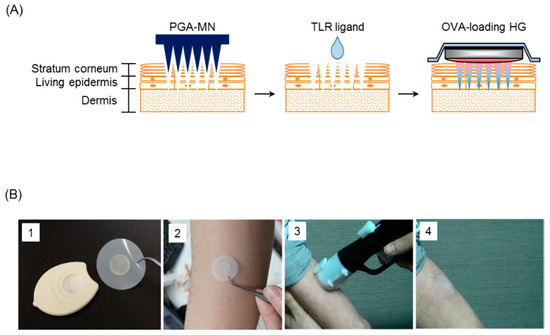Methods for epicutaneous immunization in mice and humans. Puncture holes were made on the hairless back skin of mice using biodegradable polyglycolic acid-microneedle (PGA-MN). A 5-μL volume of toll-like receptor (TLR) ligand and OVA-loaded hydrophilic gel patch (HG) were applied to the holes (A). In human subjects, (1) K3 (200 μg)-loading self-dissolving microneedle (sdMN) and placebo-sdMN were fixed to the plastic case that (2) was placed on the skin of the lateral upper arm and (3) applied with a handheld spring-type applicator that was (4) attached for an hour (B).