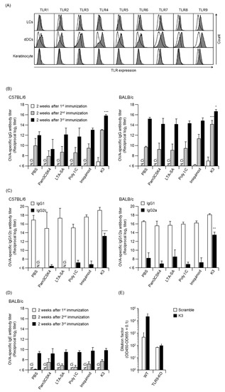 Expression analysis of TLRs in skin cells and the OVA-specific antibody response with the poke-and-patch method. Epidermal and dermal cell suspensions were analyzed for TLR expression by flow cytometry (A). The open histogram represents the isotype control group and the filled histogram represents the TLR staining group. C57BL/6 and BALB/c mice were immunized using the poke-and-patch method three times at 2 w intervals with OVA in combination with each TLR ligands. Sera were collected after immunization and assayed to determine the antigen-specific IgG (B), IgG subclass (C), and IgE (D) titers by ELISA. WT mice or TLR9-KO mice were epicutaneously immunized with K3 or the scramble peptide using the poke-and-patch method. Two weeks after the third immunization, OVA-specific IgG antibody titers were measured by ELISA (E). Data are expressed as mean ± SEM of results from three to five mice. (Student’s t-Test, * p < 0.05, ** p < 0.01, *** p < 0.005, **** p < 0.001).