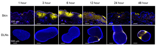 Mice were immunized with OVA and AF647-labeled K3 by the poke-and-patch method and the application site of skin and DLNs were collected over time after HG application to observe the localization of OVA and K3. These tissue samples were immersed in 4% PFA/PBS overnight at 4 °C. After a sucrose hydration treatment, the skin and DLNs were frozen in OCT compound (Sakura Finetek, Tokyo, Japan) and cut into 8-μm-thick sections using a cryostat (Leica Biosystems, Buffalo Grove, IL). The sliced sections were blocked and stained with OVA by the indirect method. OVA was stained with purified anti-OVA from abcam (Cambridge, UK) as a primary antibody and Alexa Fluor 546 anti-rabbit IgG from Thermo Fischer scientific as a secondary antibody. Histological examination of the skin samples was performed on frozen sections that were mounted with Prolong Gold antifade reagent with DAPI (Thermo Fisher Scientific, Waltham, MA) and then photographed using fluorescent microscopy (BZ-8000; Keyence, Osaka, Japan).
