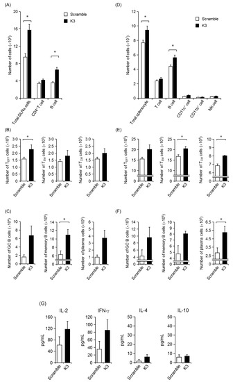 To investigate changes in the DLNs and spleen after transcutaneous administration of K3, the number and differentiation status of each immune cell were analyzed by flow cytometry. In the DLNs of the immunization site, the total cells (Figure 4A), T cells (Figure 4B), and B cells significantly increased with K3 combination treatment (Figure 4C). The differentiation of activated CD4+ T cells (CD4+ CD44high) by transcutaneous vaccine combined with K3 was also examined to investigate populations of effector T cells (TEFF; CD44high, CD127+, CD62L−), effector memory T cells (TEM; CD44high, CD127−, CD62L−) and central memory T cells (TCM; CD44high, CD127+, CD62L+) using surface markers. The subpopulation of each CD4+ T cell increased; in the CD4+ subpopulation, TEFF cells and memory T cells significantly increased with K3 combination treatment compared with the scrambled control. When the subpopulation was analyzed for B cells, germinal center (GC) B cells (CD45R+, IgG1+, GL7+, CD95+), memory B cells (CD45R+, IgG1+, GL7−, CD38+), and plasma cells (CD45R−, IgD−, CD138+) increased with the combined use of K3 compared to the scrambled control peptide.