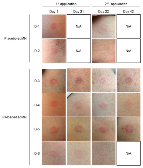 Safety evaluation of K3-loaded sdMN use in humans. Placebo-sdMN or K3-loaded sdMN were applied to the upper arm of participants twice every 3 weeks using an applicator. The day after administration (Day 1, Day 22) and 3 weeks after the first application (Day 21, Day 42); local skin reactions at the application site were observed.
