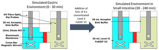 The D-P setup is outlined in Figure 2. The two chambers were separated by a biomimetic membrane which consists of a 0.45 μm polyvinylidenfluoride membrane coated with 25 μL of the GIT lipid solution. The area of the membrane was 1.54 cm2. Stirring was provided by cross-bar magnetic stirrers in both chambers and was set at 150 rpm throughout the experiment. The acceptor chamber was filled with 20 mL of acceptor sink buffer (ASB) throughout the experiment, to maintain sink conditions during the experiment [15]. The donor chamber was initially filled with 15 mL of dilute HCl at pH 2 and drug was manually introduced to begin the experiment. Thirty minutes after the initiation of an experiment, 5 mL of 4 × concentrated solution of Level II FaSSIF V2 was added to the donor chamber. The pH of the 4 × concentrated Level II FaSSIF V2 solution was adjusted in order to achieve a final pH of 6.8 in the donor chamber. The temperature was controlled to 37 °C throughout the experiment. Drug was quantified using multi-wavelength UV dip probes, with probes inserted into both the donor and acceptor chambers.