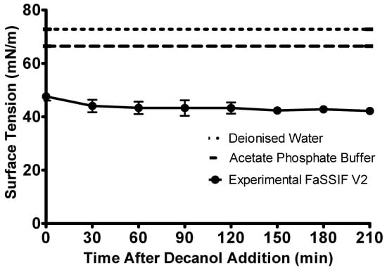 The surface tension of the aqueous layer showed only a minimal difference throughout the biphasic experiment (Figure 3). The surface tension of the FaSSIF V2 remained significantly below the surface tension of the acetate phosphate buffer (66.50 ± 0.65 mN/m, n = 3, ± SD) for the whole experiment. The surface tension changed from 47.61 ± 1.51 mN/m (n = 3, ± SD) prior to the addition of the decanol layer to 42.18 ± 1.34 mN/m (n = 3, ± SD) at the end of the experiment. The minimal decrease in the surface tension observed throughout the experiment may be caused by the introduction of the sampling needle into the vessel every 30 min. As the needle must pass through the decanol layer to sample from the aqueous phase, it was likely that this sampling procedure could introduce some contamination into the aqueous layer. However, this sampling procedure was not part of the standard biphasic experimental procedure.