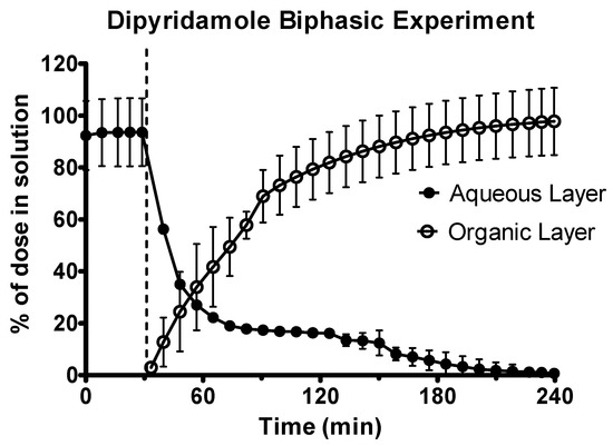 The dipyridamole suspension was rapidly dissolved in the gastric sector, as shown in Figure 4. Upon transition to the intestinal environment, dipyridamole rapidly partitioned into the decanol layer. Precipitation of the dipyridamole was observed in the aqueous layer upon transition to intestinal pH 6.8, as observed by scattering in the UV spectrum. To calculate the concentration in the aqueous layer, this scattering was corrected using the Tyndall/Raleigh method [36] as part of the inForm refine software (version 1.6.11) (Pion Inc.). Precipitation had a minor effect for dipyridamole, as the total dose (>97%) of dipyridamole was present in the decanol layer at the end of the experiment, with precipitated drug redissolved as sink conditions were regenerated due to the rapid partitioning of drug into the decanol layer.