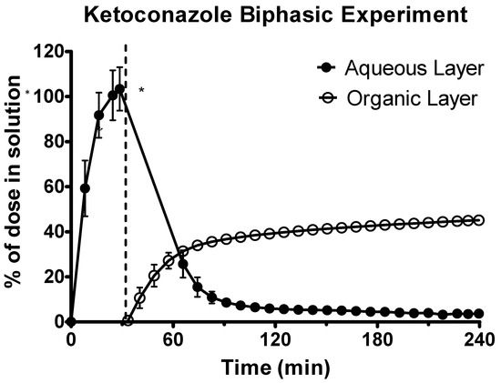 Drug release time profile for ketoconazole, dose equivalent to 20 mg API. Aqueous layer release is represented by filled circles. Organic layer data are represented by the hollowed circles. Dotted line indicates transition from gastric sector to intestinal sector. Each data point represents the mean ± SD (n = 3). * indicates where UV blackout has occurred in the aqueous phase due to precipitation.