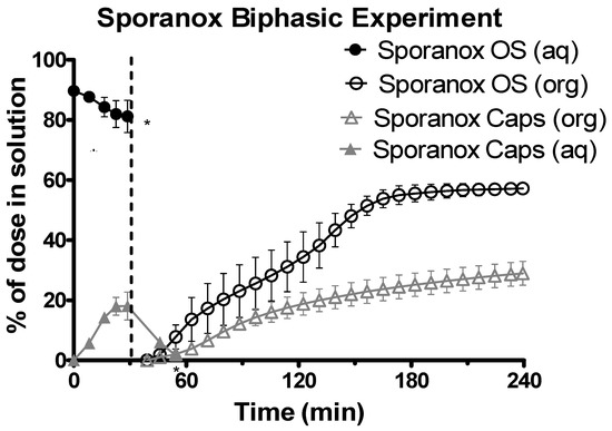 Drug release time profile for Sporanox® formulations, dose equivalent to 5 mg API. Sporanox® OS and Sporanox® Capsules are represented by black circles and grey triangles respectively. Aqueous layer release is represented by filled points. Organic layer data are represented by the hollowed points. Dotted line indicates transition from gastric sector to intestinal sector. Each data point represents the mean ± SD (n = 3). * indicates where UV blackout occurred in the aqueous phase due to precipitation and/or limitations of quantification. aq = aqueous layer. org = organic layer.