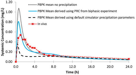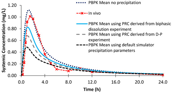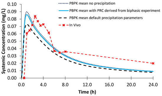 The nature of the sudden transfer from gastric to intestinal conditions was distinct from the more gradual in vivo gastric emptying process or the first order PBPK gastric emptying process [44,45]. As a result, greater precipitation rates are likely to be observed in vitro with the sudden shift in intestinal conditions. In addition, the CSC was likely to be overestimated due to the use of solvent in the experimental setup. However, overestimation of both the CSC and PRC are likely to somewhat confound each other; a higher CSC will mean that precipitation will start later in the model, but this precipitation will occur at a faster rate due to the larger PRC value. The effect of the combination of these errors could lead to a similar AUC compared to in vivo, albeit with a slightly different shape of the plasma profile.